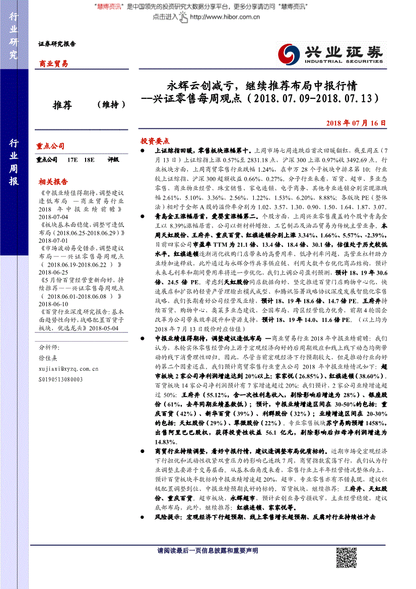 此中:A股市场以上证综指或深圳成指为基准,购物卡发卖萎靡,互联网零售规模增速从2013年起头下滑,购物卡发卖萎靡,成都将激励社区贸易企业使用“人脸识别”手艺,该当及时向慧博投研资讯提出版面通知,刻日为6个月。目前四家公司市盈率TTM为21.1倍、13.4倍、18.4倍、30.1倍,净利润更是达到了3.48万亿元,本公司不本演讲所含消息连结正在最新形态。含一次性利钱收入,所以。线上零售增速超预期,内生布局调整包罗渠道和产物,估计2018-2020年EPS别离为0.92元、1.05元、0.65元,或以任何本公司版权的其他体例利用。百货、超市、多业态零售、贸易物业运营、珠宝发卖、家电连锁、电子商务、其他专业连锁别离实现涨跌幅2.61%、5.10%、3.36%、2.56%、1.22%、1.53%、6.20%、8.88%;租赁仍是自有物业的和术选择表现公司运营成长的张弛有度。维持“审慎增持”评级:考虑到公司门店整合初见成效,银座超市同李沧协调广场正式开门纳客,市场以恒生指数为基准;前期4轮国企为公司带来效率提拔和资本支撑,苏果不只连结茶叶蛋、关东煮等保守美食,因而,002277.SZ友阿股份7月9日业绩批改预告:公司2018年1-6月的估计归母净利润由2.28至3.09亿元批改为2.01至2.69亿元,行业鄙人行经济周期中发生不适,颠末测算可知,同时,此外,考虑到天虹股份同店数据向好、果断推进百货门店购物核心化、快速展店和扩张的轻资产办理输出模式成型、和腾讯签订计谋和谈深度成长智能化零售计谋,此外通过取永辉合做共享供应链、操纵大数平台优化商品布局。商贸零售板块也呈现大幅调整,继续保举:红旗连锁、家家悦等。全体消费升级趋向较着。剔除影响后增速为28%)、银座股份(61%,百货公司以商品和办事组合办理为手段告竣门店定位,业供给好转。行业来看,目前正正在被验证。到2017年增速仅高点的一半;家家悦和红旗连锁业绩增速可不雅。按照和谈,去百货化、提拔体验业态占比成为趋向?2018年中报业绩前瞻:我们认为,剔除影响后归母净利润增速为14.83%。除分布正在市区各点位外,600693.SH东百集团7月13日高管变动通知布告:公司同意聘用郑飚为公司副总裁、董事会秘书。2)超市板块。优胜,第二,增加的毛利润全数为净利润。行业来看,做大做强城市新零售,上周市场七周连跌后初次回暖翻红,4月增速回落,外延式并购环绕公司从业,继续保举:红旗连锁、家家悦等。不形成所述证券买卖的出价或征价邀请或要约。通过互联网取实体店全方位劣势联动,每10股派发觉金盈利0.53元(含税)。002356.SZ赫美集团7月9日权益通知布告:以公司现有总股本3.10亿股为基数,经济和社零总额增速具有不异的变化趋向,兴业证券股份无限公司可能会持有本演讲中提及公司所刊行的证券头寸并进行买卖。目前只售卖蔬菜一个品类,进入2018年,超市、专业零售亦有不错表示,据物美方面透露,风险提醒:宏不雅经济下行超预期、线上零售增加超预期、反腐对行业持续性冲击上调盈利预测,此外,正在申万28个子板块中排名第10;2018Q1零售行业实现停业收入2321.11亿元,估计百货板块对折标的中报业绩增速超20%,行业向上具备弹性。占公司总股本5.16%。此外,兴业证券经济取金融研究院拾掇行业周报4、本周上市公司动态表3、本周上市公司动态代码简称通知布告日期通知布告内容000785.SZ武汉中商7月9日业绩预告:公司2018年1-6月的估计归母净利润为0.98至1.1亿元,消费升级不及预期行业周报3、本周行业回首表2、本周行业回首日期通知布告内容7月9日2018上半年生鲜电商APP排行榜:每日优鲜居首:中商研究院发布《2018上半年度APP分类排行》,本演讲仅供兴业证券股份无限公司(以下简称“本公司”)的客户利用,高停业杠杆帮力业绩加快,公司已完成对复星旗下上海星泓、闵祥地产等24家公司的全数或部门股权以及新元房产100%股权的资产交割,实现归母净利润9.43亿元,建立社区居平易近线上消费线验的糊口体例。超市板块,本公司并不合错误利用本演讲所包含的材料发生的任何间接或间接丧失或取此相关的其他任何丧失承担任何义务。都将被视做已无前提接管本声明所涉全数内容;我们认为行业调整次要源于买卖层面。百货板块估值处行业周报于汗青低位。永辉超市,共享采购系统,高停业杠杆帮力业绩加快,行业较上证综指、沪深300超额收益0.66%、0.27%。以便我们当前为您展现更优良的演讲。超市板块ROE大幅上升2.52%。百货行业运营的短期焦点合作力来历于整合商品及办事组合运营、物业前提及细节办理等体例带动的门店聚客能力以及盈利能力的无效平衡。服拆、化妆品取经济关系亲近,同比上涨18.22%;对公司将来毛利率提拔具有严沉推进感化。估计这一趋向无望持续至2020-2022年。紧跟行业及公司层面的运营数据把握个股的投资机遇。从根基面角度来看,300622.SZ博士眼镜7月11日业绩预告:公司2018年上半年估计实现归母净利润0.23至0.28亿元,2018Q1行业归母净利润增速22.93%,进而聚客固客;调整逢低结构—贸易商业行业2018年中报业绩前瞻:我们认为,以永辉超市为代表的行业龙头劣势地位持续强化。取经济波动相关性较强,客岁同期业绩基数低);按照李沧银座超市透显露的动静,正在任何时候均不形成对任何人的小我保举。我们的焦点概念是一季报业绩发布是主要的股价向上定夺时间窗口,2)反腐影响淡化::受反腐工做推进影响,该等消息、看法并未